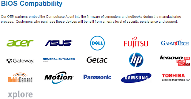 Absolute Software is the creator of Computrace, a piece of software that provides tracking, compliance monitoring and more for computers running Windows or Mac in enterprise settings. For home users they have Computrace Lojack for laptops.Much more interesting than the standard software which can be installed & removed like any other software, they also have OEM partners that implements the Computrace agent into BIOS. Once you install a compatible operating system onto the computer, the agent gets installed silently into the OS from BIOS. Hoohaa! This is an overview of OEM partners taken from their own webpage: